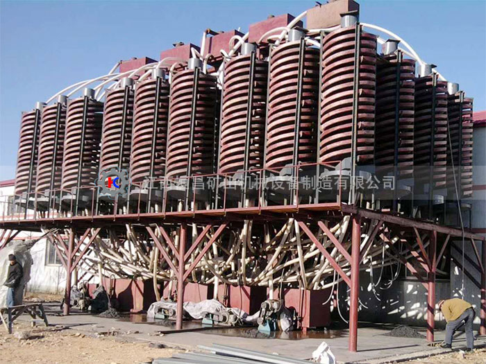 將BLL玻璃鋼螺旋溜槽立起校準(zhǔn)垂直線,用鐵架或木頭固定在合適的位置,由砂泵將礦漿送到螺旋上頂兩個(gè)進(jìn)料口處,加入補(bǔ)充水,調(diào)節(jié)礦漿濃度,礦漿自然從高往下旋流在旋轉(zhuǎn)的斜面流速中產(chǎn)生一種慣性的離心力,以礦砂的比重、粒度、形狀上的差異,在旋流的重力和離心力的作用下將礦與砂分開;螺旋溜槽的尾端裝有閥塊式產(chǎn)品截取槽,將分選的產(chǎn)品沿徑向按品位分成三種,用調(diào)節(jié)閥塊的位置來改變各產(chǎn)品的截取寬度,精礦流入精礦斗用管道接出,尾砂流進(jìn)尾砂斗用管道接到砂池。