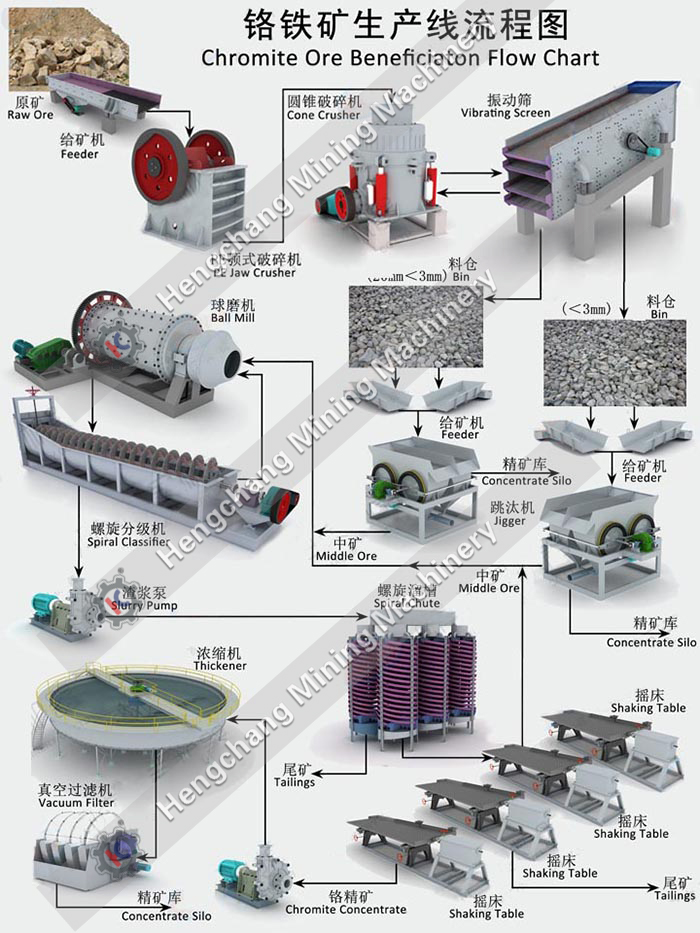 對于鉻礦選礦,有重選、浮選、磁選等多種方法,江西恒昌礦機會根據(jù)礦石分析報告及選礦試驗報告等給出最終的選礦方法。其中常用的重選主要選礦流程為:兩段破碎,一段磨礦,螺旋溜槽粗選,螺旋溜槽掃選、搖床精選工藝。